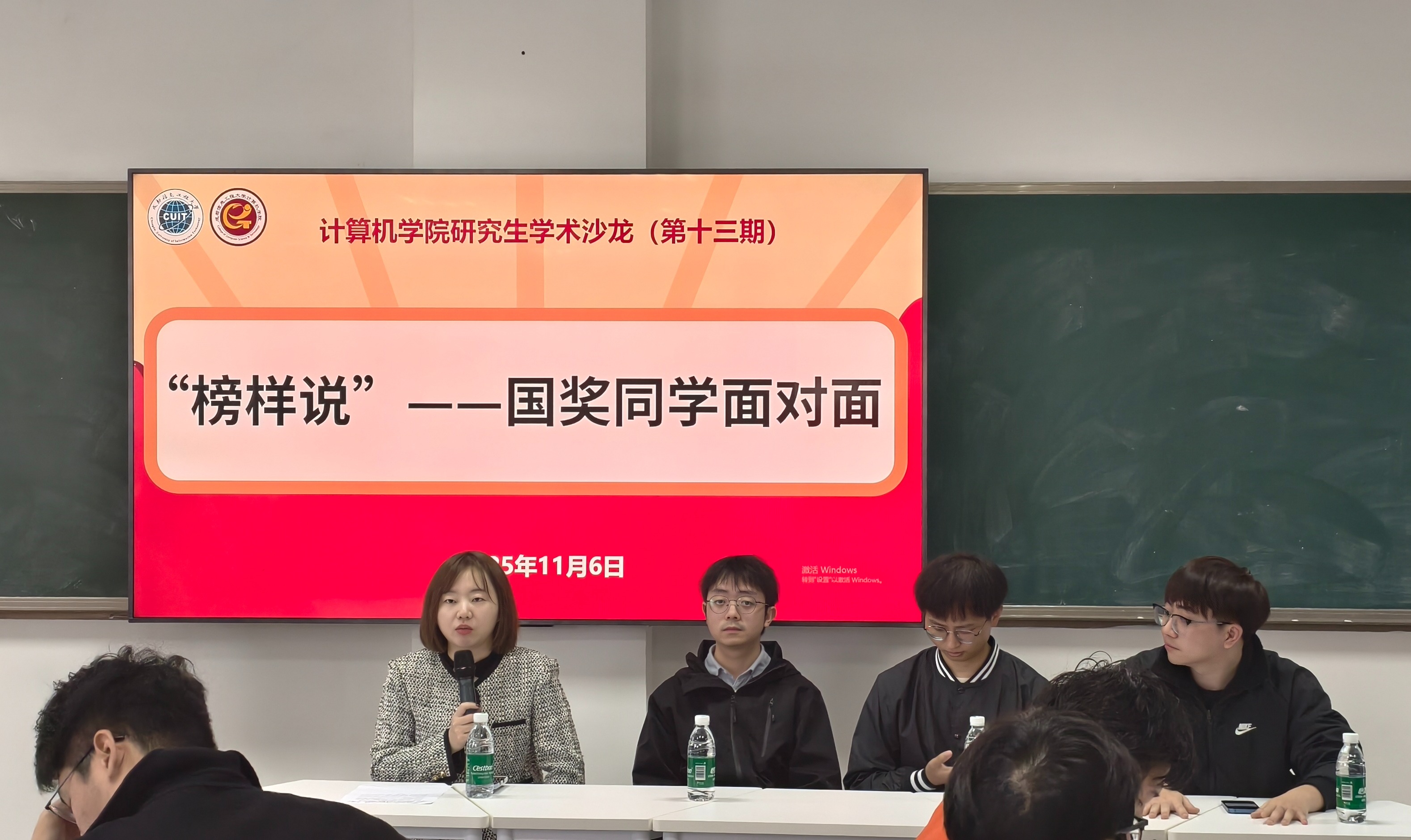 在问答访谈环节,曹佳阳与三位国奖代表同学就前期征集的信息,对学习、科研、职业规划等问题进行互动交流,三位分享同学针对问题,结合自身体会、切身经历,一一作答,有效地解决了低年级研究生在学习、科研等方面的诸多疑惑。